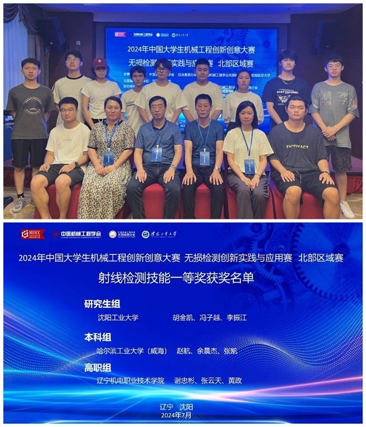7月24日至27日,由中国机械工程学会主办,沈阳工业大学承办的全国无损检测创新实践与应用赛北部区域赛圆满落下帷幕。我校学生谢忠彬、张云天、黄政组成的团队在教师韩雪的指导下荣获射线检测赛项一等奖;学生肖方剑、于晓涵、张诗琪组成的团队荣获二等奖。学生冯泊远、刘志卿、刘琦组成的团队在教师王洋的指导下荣获超声检测赛项二等奖。学生马欣源、周俊鹏、李美潼组成的团队及杨钰坤、金子琪、杜文博组成的团队在教师崔国建、赵玲的指导下荣获渗透检测赛项三等奖。