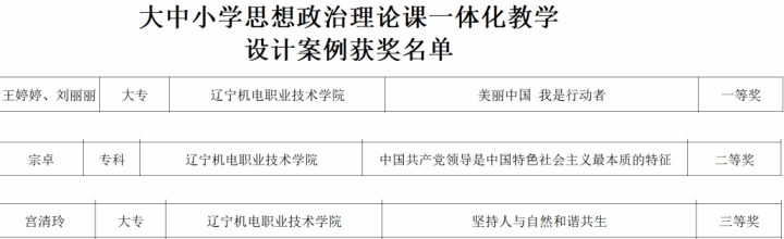 近日,辽宁省高校思想政治理论教育研究会公布了辽宁省“大中小学思政课一体化建设”专题教学设计案例征集活动获奖名单,由我校推荐的3个教学设计案例均获奖。