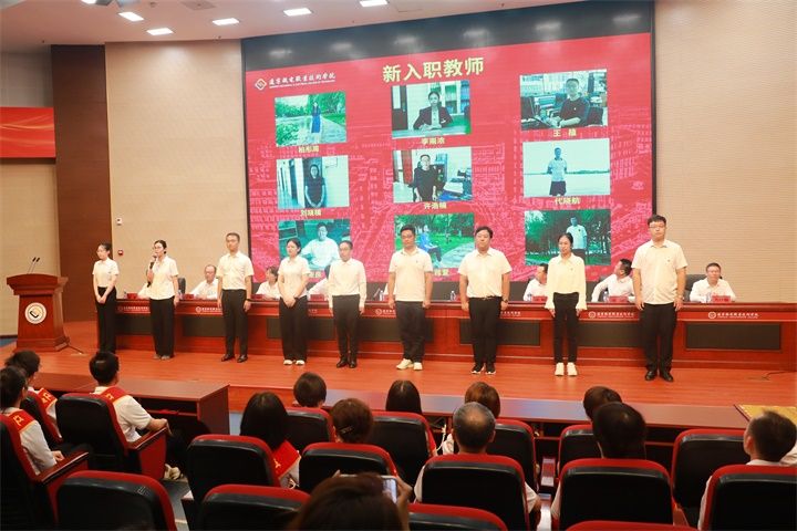 全体教职员工重温《人民教师誓词》。电气工程学院教师于晓云作为受表彰教师代表上台发言,新入职教工上台与大家见面并作自我介绍。
