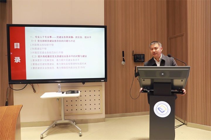 会议邀请沈阳航空航天大学招投标办公室党支部书记林海森作“在真懂真干真为中见真效----着力提升高校基层党组织建设质量”专题培训。他从党支部标准化规范化建设实务,基层党组织“一融双高”的实现,标杆院系、样板支部的创建等三个方面作了深入浅出的讲解,并引用10余个实践案例从思想政治引领、推动事业发展、服务能力建设等方面提出了实践范式,对指导做好学校基层党建工作具有较强的针对性和实操性。