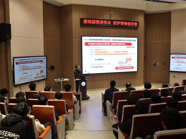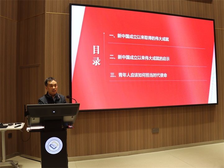 本次思政课在我们党团结带领全国各族人民绘就的波澜壮阔的历史画卷中开始。段振云首先全面梳理了新中国成立以来取得的伟大成就,并系统总结了新中国成立以来伟大成就的五个必须的重大启示。讲授中,段振云勉励同学们要践行“厚德笃行”的校训精神,一是要保持学习热情,多读有字之书。不能满足于碎片化信息、快餐化知识,从前人的智慧结晶中加强专业技术学习、增强实践操作本领;二是要扩大知识半径,多读无字之书。积极参加各类社会实践与技能大赛,催生更多创新之花创造之果,从实践中探索新途径、找寻新方法。