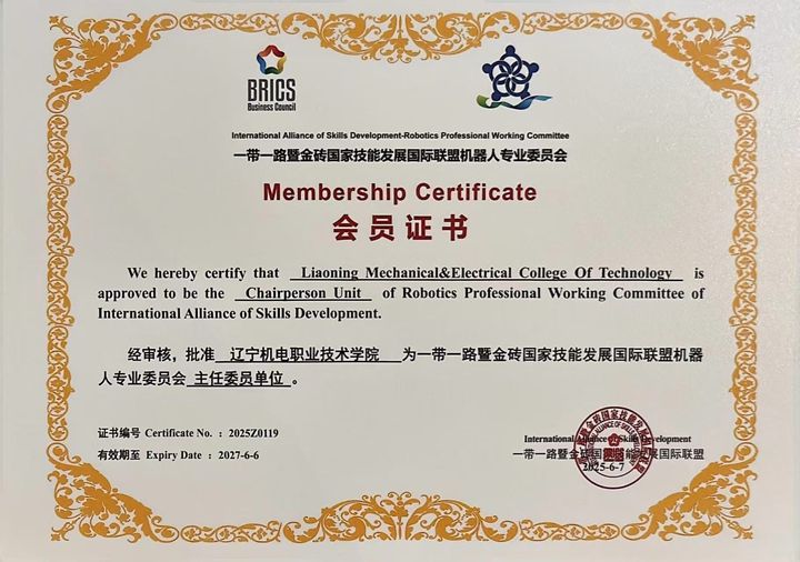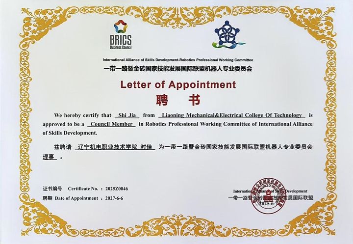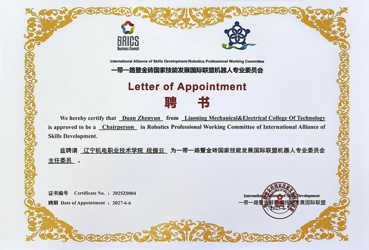 会上,我校获批“一带一路暨金砖国家技能发展国际联盟机器人专业委员会主任委员单位”;校长段振云获聘“一带一路暨金砖国家技能发展国际联盟机器人专业委员会主任委员”;电气工程学院副院长时佳获聘“一带一路暨金砖国家技能发展国际联盟机器人专业委员会理事”。