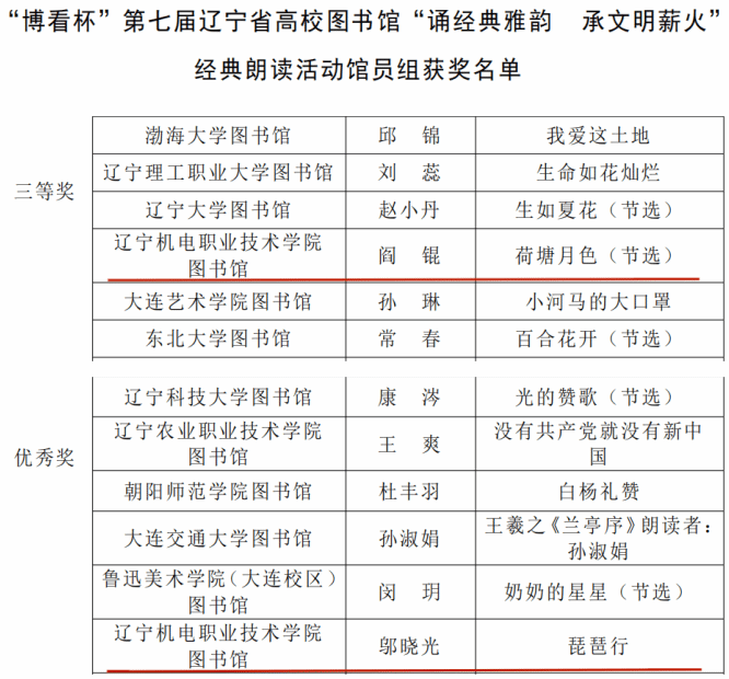 为深入弘扬中华优秀传统文化,增强文化自信,提升图书馆文化服务水平,近日,辽宁省高等学校图书情报工作委员会组织开展了“博看杯”第七届辽宁省高校图书馆“诵经典雅韵 承文明薪火”经典朗读活动,我校图书馆馆员阎锟、邬晓光分获馆员组三等奖、优秀奖。
