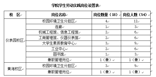 学院“学生劳动教育实践岗”的设置,是根据仪表园校区和黄海校区实际情况而定,分为18个岗位,每岗3人。实践岗位报名在个人申请、院系推荐、民主集中的原则上,共有241名同学脱颖而出,最终选出54名诚实守信、品学兼优、积极上进的同学作为劳动实践岗人员。