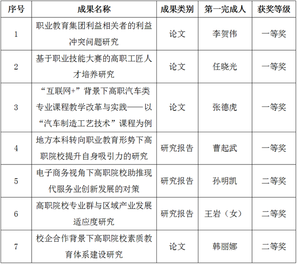 申报期间,学校高职教育研究所根据《辽宁省职业技术教育教学优秀职业教育科研成果评选办法》(辽职学会字[2016]19号)和《关于开展辽宁省职业技术教育学会优秀科研成果评选活动的通知》(辽职学会字[2021]7号)要求,积极组织申报,共推荐十项成果参与本次评选,经过学会评审,我校有七项成果获奖。