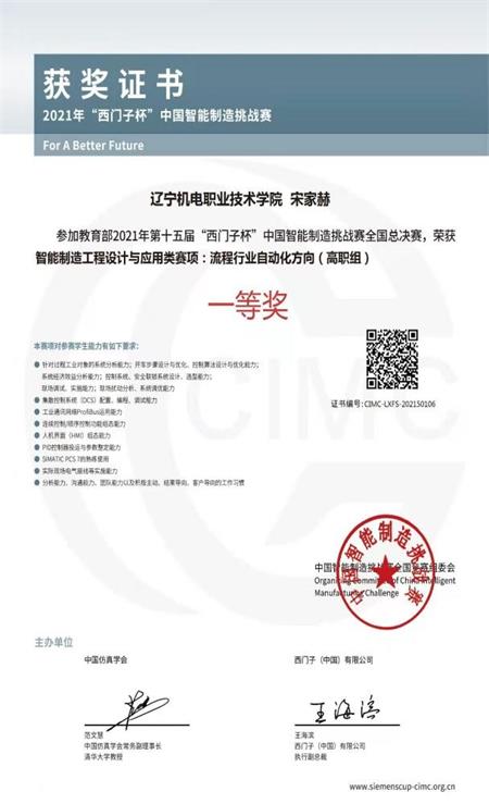 11月7日到15日,教育部2021年第十五届“西门子杯”中国智能制造挑战赛全国总决赛在线上落下帷幕。我校华孚仪表学院学生王宇博,宋家赫、刘瑞、刁林科、陈光浦、张株溪、闻英博在教师马哲、孟冉的指导下荣获大赛一等奖;学生魏忠伟,甘富豪、秦文来、石程、朱政权、郭嘉垚、庞博、吴金新、孙帅、张嘉禧、梅得利、郑宪舣在教师薛明姬、张雯雯的指导下荣获大赛一等奖;学生王浩宇、孙明扬、王思源、牛志远、赵家兴在教师宋艳丽的指导下荣获大赛一等奖。