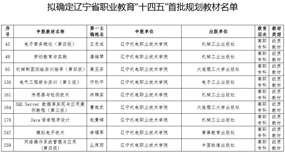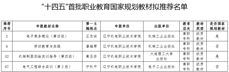 日前,辽宁省教育厅对“十四五”首批职业教育国家规划教材遴选暨辽宁省职业教育“十四五”首批规划教材进行公示,由我院推荐的10本教材中有9本入选辽宁省职业教育“十四五”首批规划教材,其中《电子商务概论(第四版)》《劳动教育与实践》《机械制图测绘实训指导(第四版)》和《电气工程综合实训(第2版)》4本教材推荐参加“十四五”首批职业教育国家规划教材评选。