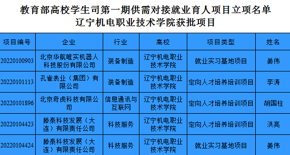 近日,教育部高校学生司公布了第一期供需对接就业育人项目立项名单,由我院姜伟老师联合北京华航唯实机器人科技股份有限公司申请的“就业实习基地项目”、李涛老师联合孔雀表业(集团)有限公司申请的“定向人才培养培训项目”、胡国柱老师联合北京奇虎科技有限公司申请的“定向人才培养培训项目”、洪亮老师联合滕泰科技发展(大连)有限责任公司申请的“定向人才培养培训项目”、姜伟老师联合滕泰科技发展(大连)有限责任公司申请的“就业实习基地项目”等五个项目获准立项。