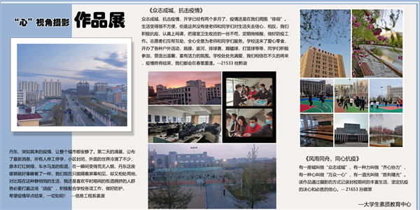 同时,我校还利用学习通平台建立全面发展健康服务专区,推送疫情防控的相关健康教育资源;制作疫情防控中的心理防护小锦囊;开通网络咨询平台,利用QQ、微信等各种方式为学生提供心理咨询服务;还开展了“心”视角摄影作品展示、心理征文比赛和校园心理情景剧大赛。