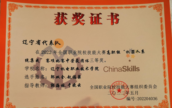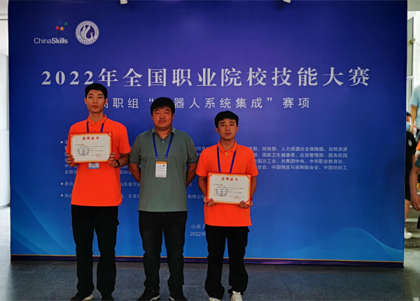 2022年全国职业院校技能大赛高职组“机器人系统集成”赛项于8月15至18日在山东省潍坊市举办。由我院自控系学生邬双全、赵福泉组成的参赛队在教师郭海林、于晓云的指导下荣获大赛三等奖。