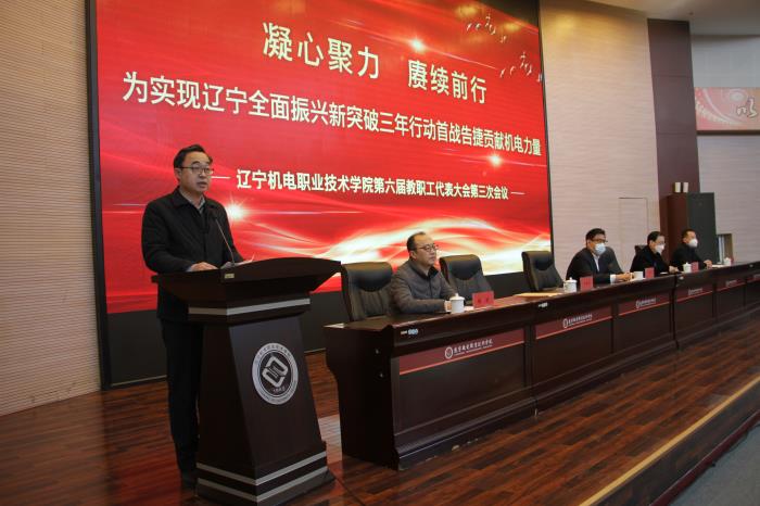 于宏国作题为“凝心聚力、赓续前行,为实现辽宁全面振兴新突破三年行动首战告捷贡献机电力量”的工作报告。在2022年重点工作回顾中他表示,2022年极不平凡,学院以习近平新时代中国特色社会主义思想为指导,学习宣传贯彻党的二十大精神,大力推进国家“双高计划”建设、提质培优行动、兴辽“双卓越”等重大项目,绩效显著。他指出,一年来学院加强党的建设、全面从严治党,统筹疫情防控、筑牢安全防线,落实立德树人、构建思政融通,锚定重大项目、注重质量提升,深化“三教”改革、聚焦内涵建设,推进产教融合、增强社会影响。