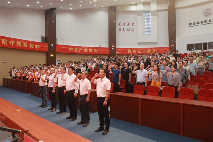 人力资源处(教师发展中心)处长贾涛领誓《人民教师誓词》,全体教职员工举起右拳,庄严宣誓,重温誓词。