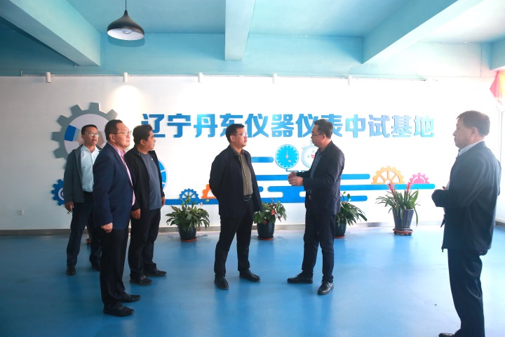 副院长宁秋平(右2)陪同白雪原(左4)一行参观学校实训基地