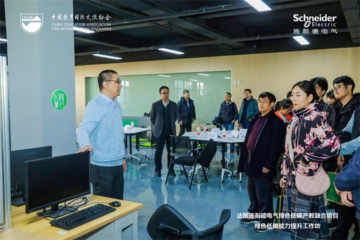 与会人员参观了学校施耐德绿色低碳产教融合实训基地,并就如何将项目融入人才培养方案等内容开展讨论。