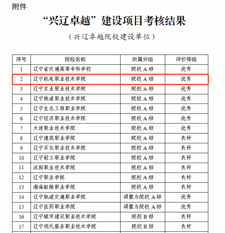 此次考核依据《关于开展辽宁省“兴辽卓越”院校、“兴辽卓越”专业群建设项目年度考核工作的通知》要求,经学校自评、院校互评、省级评定三个环节,确定9所院校考核结果为“优秀”等级、12所院校为“良好”等级、4所院校为“合格”等级;在“兴辽卓越”专业群建设单位中,2所院校考核结果为“良好”等级、7所院校为“合格”等级。