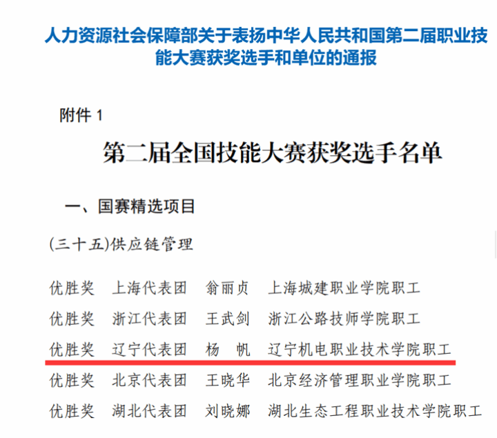 近日,人力资源社会保障部发布《关于表扬中华人民共和国第二届职业技能大赛获奖选手和单位的通报》,我校教师杨帆在教练赵东明的指导下荣获第二届全国职业技能大赛“供应链管理”赛项优胜奖。