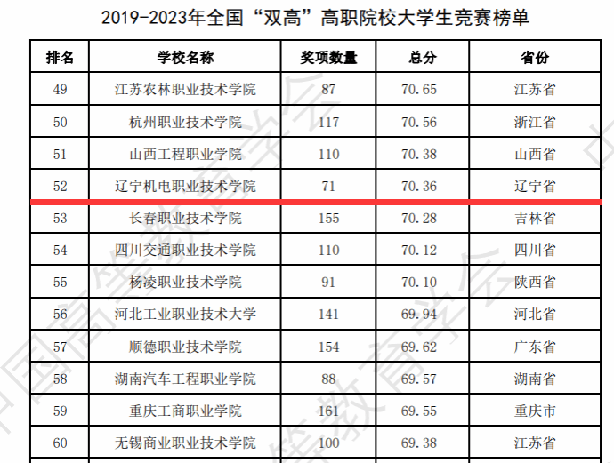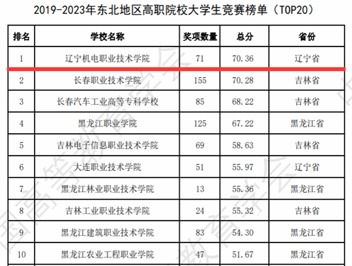 近日,中国高等教育学会高校竞赛评估与管理体系研究专家工作组发布《2023全国普通高校大学生竞赛分析报告》,我校获“2019-2023年东北地区高职院校大学生竞赛榜单”第一名。