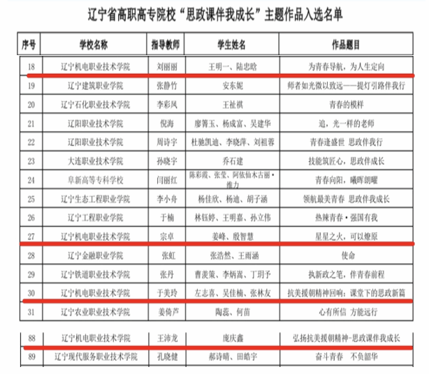 近日,辽宁省高职高专院校思想政治理论课建设联盟面向全省高职高专学生开展的“思政课伴我成长”主题作品征集活动落下帷幕。经专家遴选,我校学生创作的《为青春导航,为人生定向》《星星之火,可以燎原》《抗美援朝精神回想:课堂下的思政新篇》《弘扬抗美援朝精神——思政课伴我成长》四部作品被收录至《春华秋实——辽宁省高职高专院校“思政课伴我成长”主题作品集(2024年)》中。